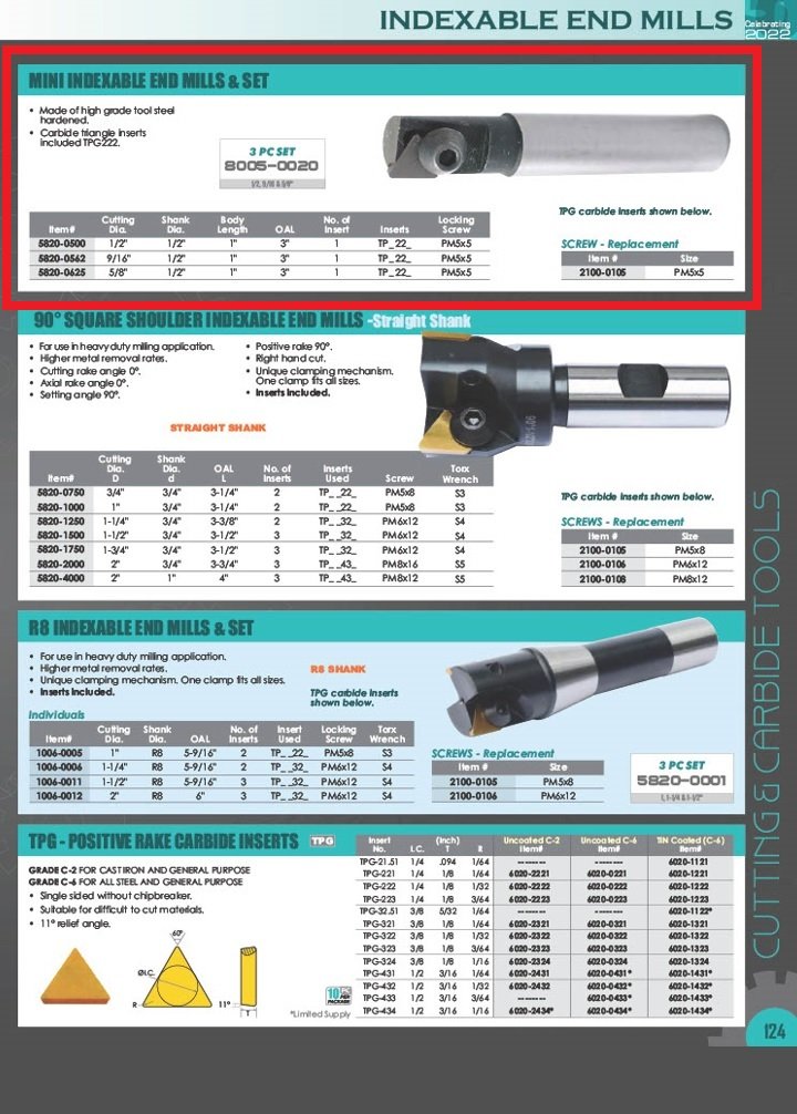 1/2 X 3″ MINI INDEXABLE END MILL (5820-0500). Key features: 1/2 X 1/2″ Shank Mini Indexable End Mill; Made of hardened, high grade tool steel..
