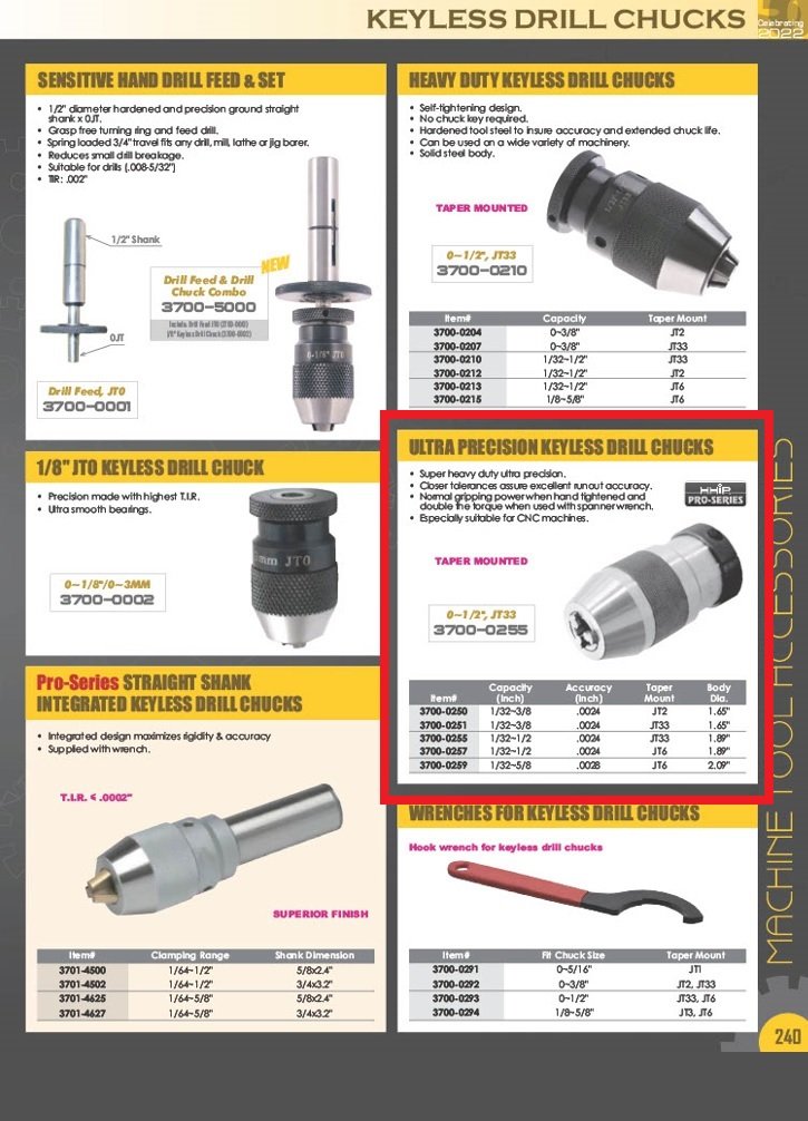 1/32~5/8″ JT6 ULTRA PRECISION KEYLESS DRILL CHUCK (3700-0259). Key features: 1/32-5/8″ JT6 Ultra Precision Keyless Drill Chucks; Super heavy duty ultra precision..