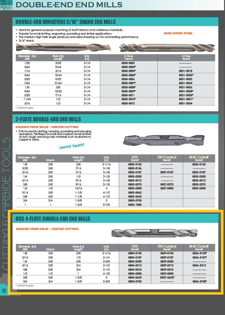 1/8 X 3/8″ 4 FLUTE TiN DOUBLE END CENTER CUT END MILL (5829-0125). Key features: 1/8 X 3/8″ 4 Flute Tin Double End Center Cut End Mill; Ground From Solid.