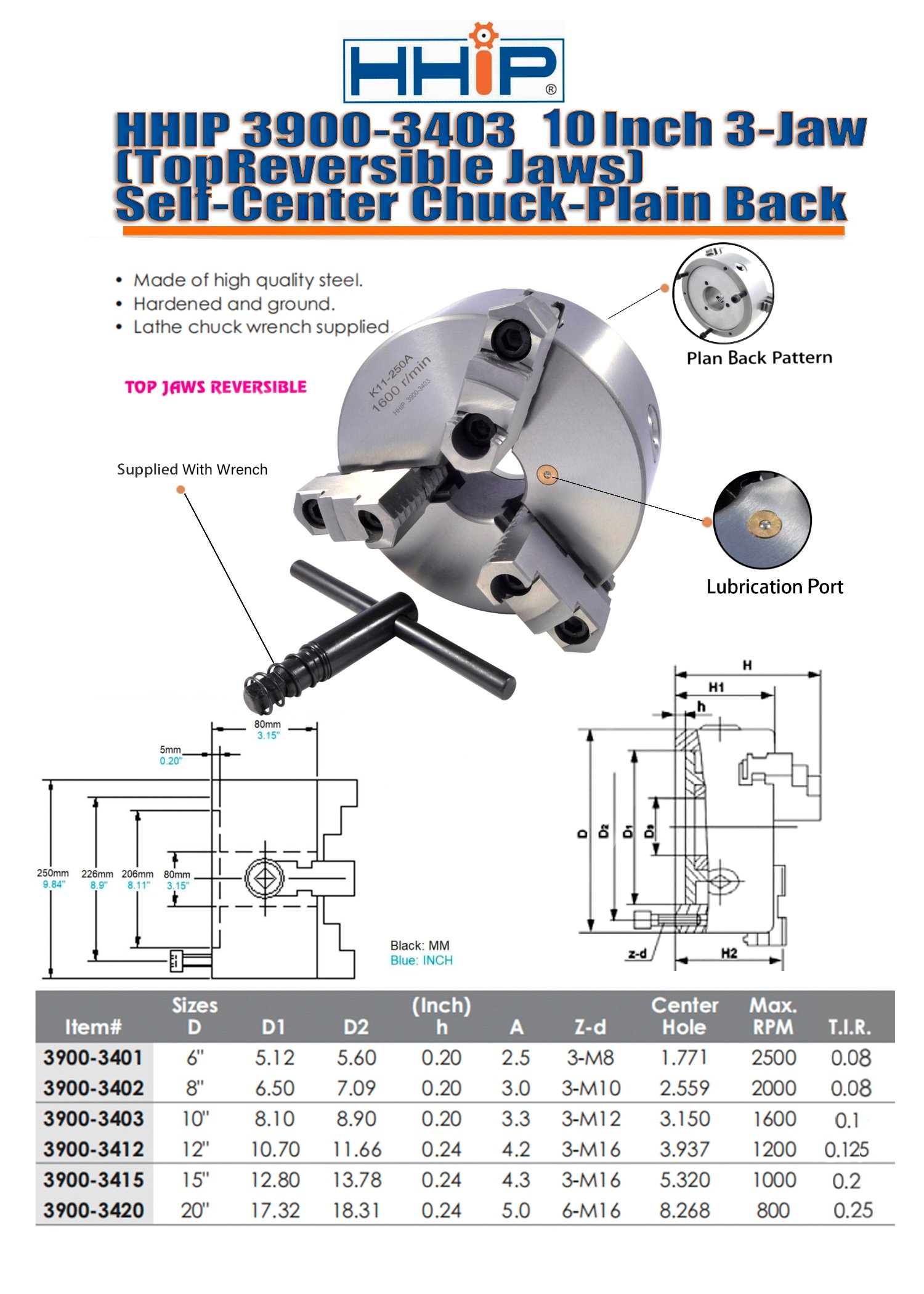 10″ 3 JAW PLAIN BACK TOP REVERSIBLE SELF CENTERING LATHE CHUCK (3900-3403) (SKU: 3900-3403)