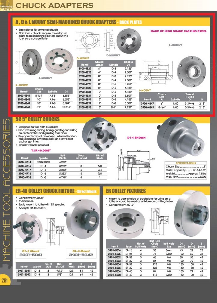 - Plain-back chucks require the adapter plate to be machined before mounting to ensure concentricity.