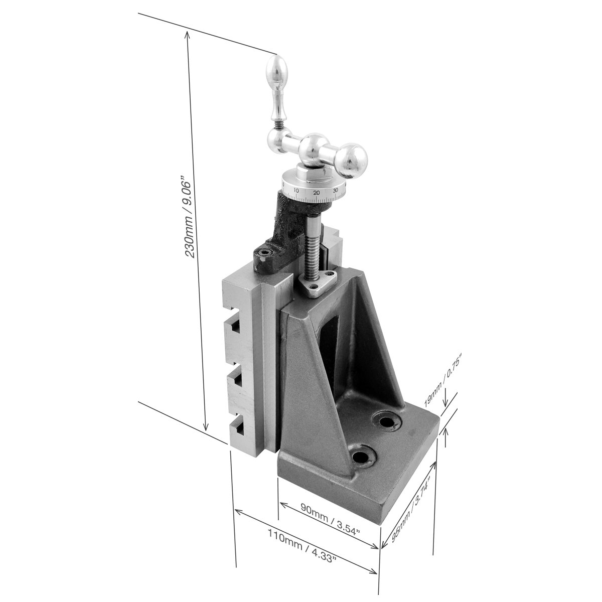 - Easy to bolt on a mill table with 2 bolt holes (9mm/0.354″ diameter).