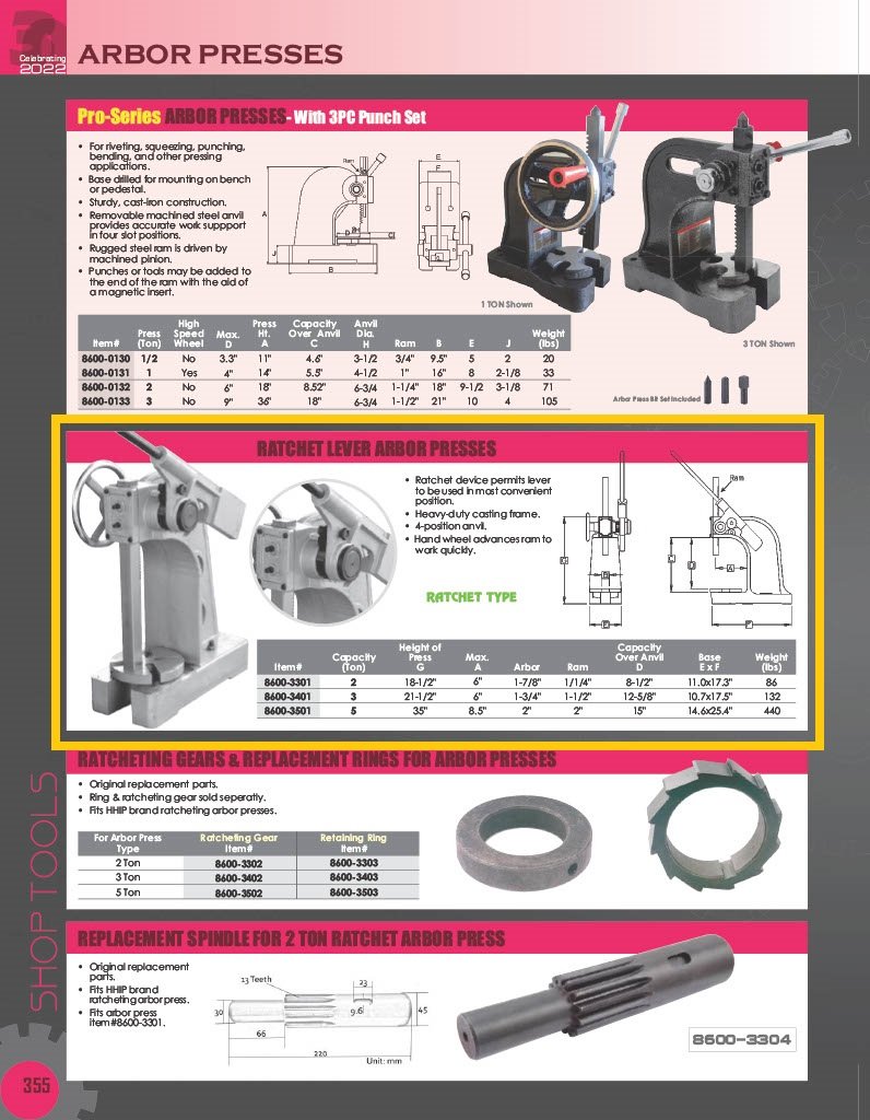 HHIP 2 Ton Ratchet Type Arbor Press Heavy-duty casting frame with a 4-position anvil for flexibility. Press height is 18-1/2″. Ram diameter is 1-1/4”. Capacity over table is 8-1/2” and over the anvil is 7.28”. Maximum work diameter is 9.44”. Weight is 100 lbs. Compact, manually operated tool for controlled pressing force. Versatile, precise, and durable; suitable for bending, riveting, broaching, punching, etc. Cost-effective, safe, and low-maintenance option for various industries. Convenient Lever Use: The Ratchet device allows lever usage in the most convenient position. Hand Wheel: Included hand wheel advances ram quickly. Controlled Force: Precise force application for accurate results. Ratcheting Mechanism: Incremental force application with ease. Adjustable Height: Accommodates different workpieces. Space-efficient: Compact design for limited workshop spaces. Manual Operation: No external power is needed; simple to operate. Used in metalworking, woodworking, jewelry-making, and more. Beneficial for teaching mechanical principles and techniques.