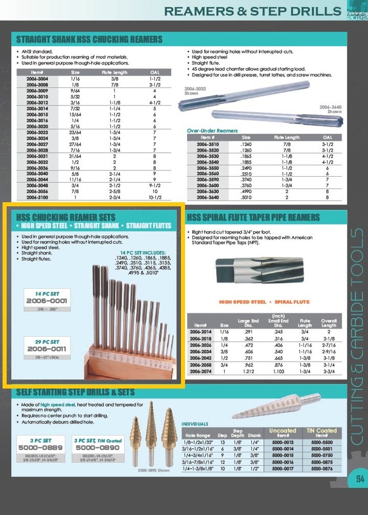 29 PIECE 1/16-1/2″ X 64THS HIGH SPEED STEEL CHUCKING REAMER SET (2006-0011). Key features: 29 Piece 1/16-1/2″ X 64ths High Speed Steel Chucking Reamer Set; Straight shank..