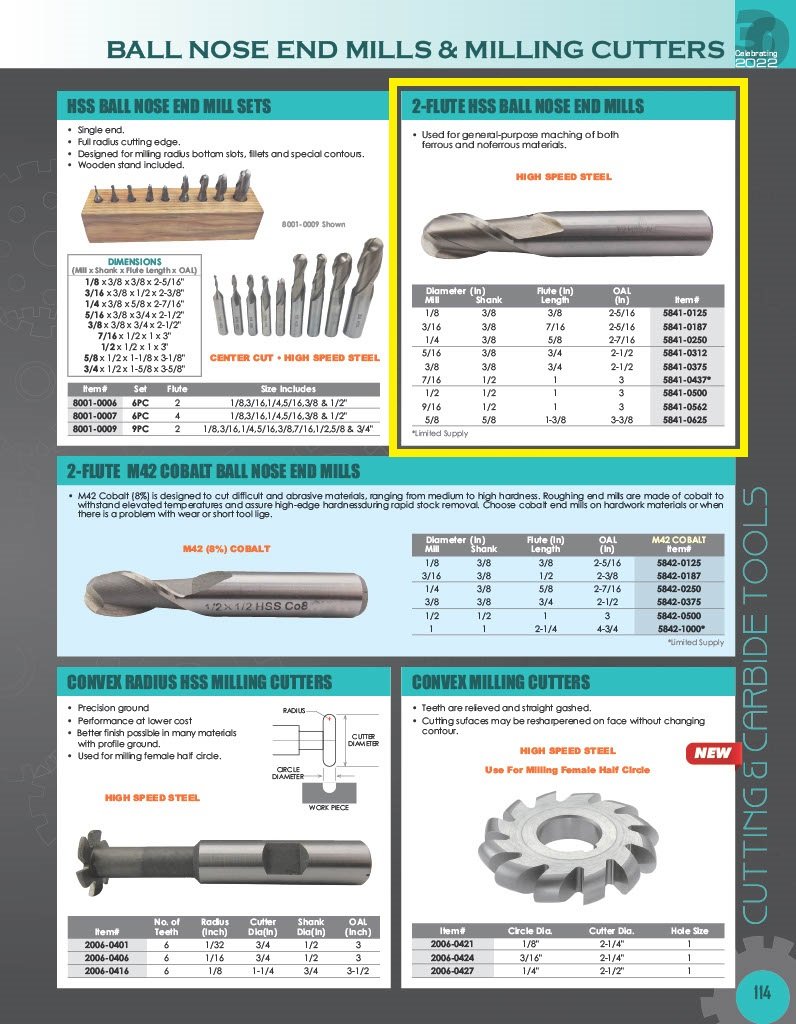 3/16 X 3/8″ 2 FLUTE HIGH SPEED STEEL SINGLE END BALL END MILL (5841-0187). Key features: 3/16 X 3/8″ 2 Flute High Speed Steel Single End Ball End Mill; Cutting diameter is 3/16″..