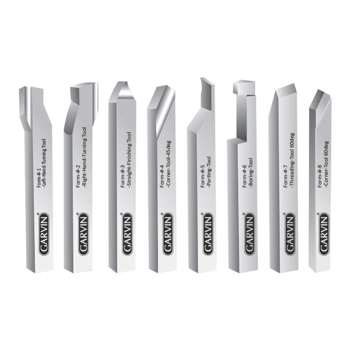 - Set includes No.1 Left-Hand Turning Tool (80°), No.2 Right-Hand Turning Tool(80°), No.3 Straight Finishing Tool, No.4 Corner (45°) Tool, No.5 Parting Tool, No.6 Boring Tool, No.7 Threading (60°) Tool, No.8 Corner (60°) Tool