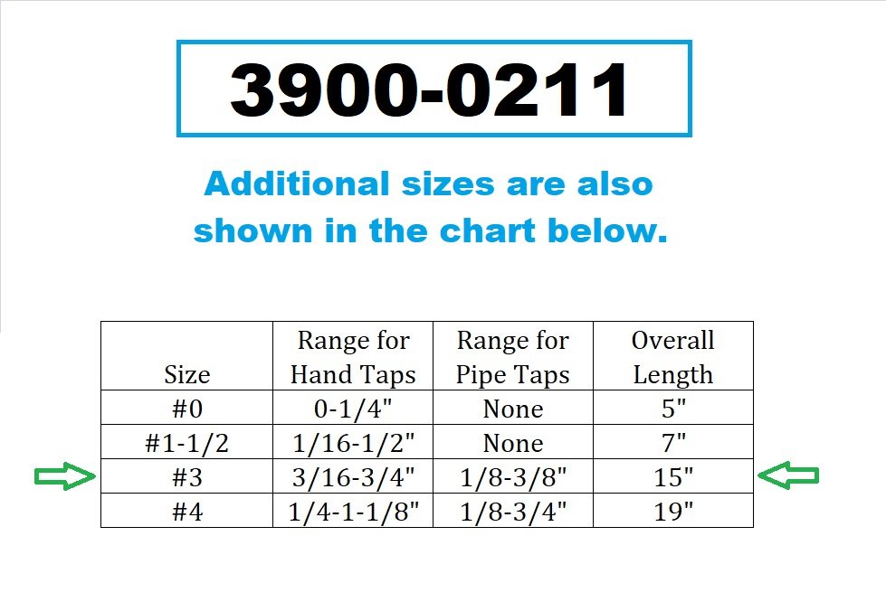 - For 3/16 to 3/4″ hand taps or 1/8 to 3/8″ pipe taps.