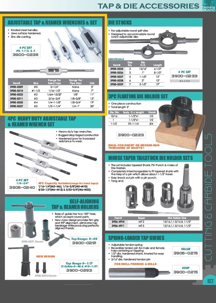 - For 3/16 to 3/4″ hand taps or 1/8 to 3/8″ pipe taps