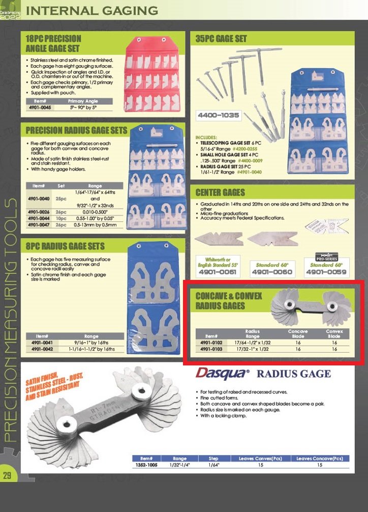 32 PIECE 17/32-1 X 32THS CONCAVE & CONVEX GAGE SET (4901-0103). Key features: 32 Piece Concave & Convex Gage Set; Radius range is 17/32-1 X 1/32..