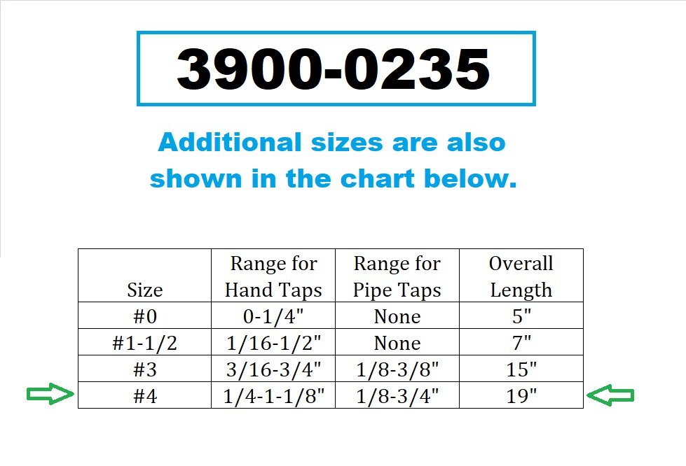 - For 1/4 to 1-1/8″ hand taps or 1/8 to 3/4″ pipe taps.