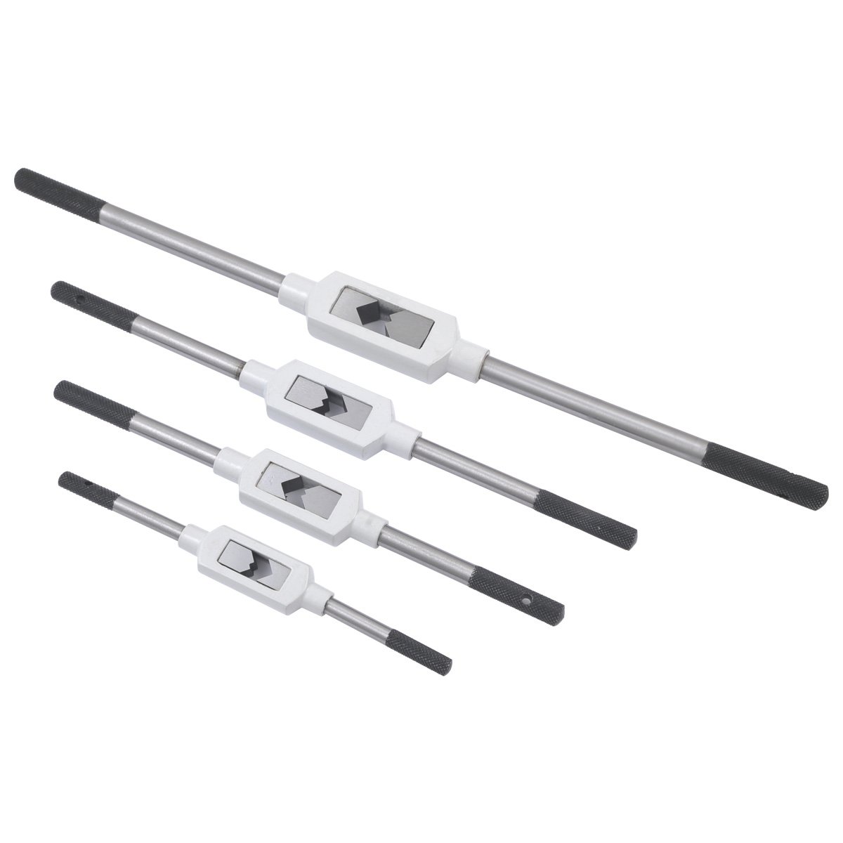 4 Piece Adjustable Tap & Reamer Wrench Set-Drop Forged Heavy duty tap wrenches. Rugged drop forged construction. Hardened jaws for increased longevity. 4 piece capacities include 1/16-1/4″ (M2-M6), 1/16-3/8″ (M2-M10), 5/32-1/2″ (M6-M12) & 5/32-3/4″ (M6-M20). Used for creating internal threading for fasteners (screws and bolts) & fixing cross-threaded or blunt threads. Also great for threading worn-out nuts or new holes, drilling thread holes, tapping new threads & transforming a metal rod into a bolt.