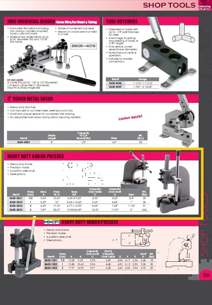 HHIP 5 Ton Heavy Duty Arbor Press with 18.76″ Max Height Heavy duty frame. Precision made. 4 position steel anvil. Steel pinions.