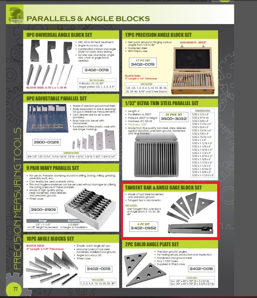 - Set includes one tangent bar and one each of angle blocks 5, 10, 20, 30, and 45°
