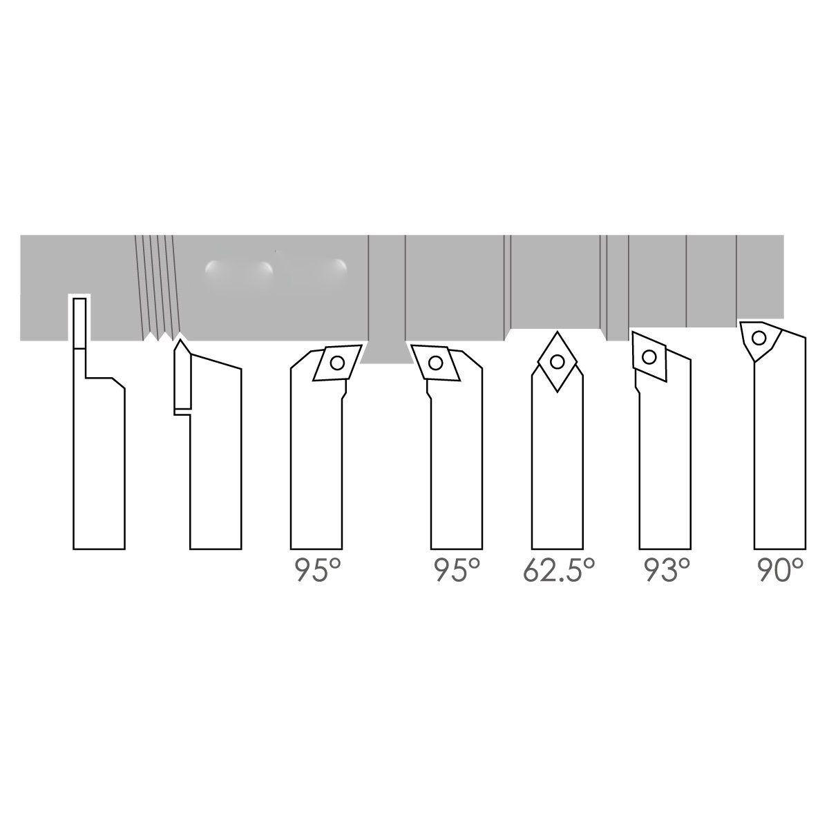 - Includes 90 degree right hand holder A,93 degree right hand holder B, 95 degree right hand holder C, 62.5 degree right hand holder D, 95 degree left hand holder E, external threading holder F and cut-off tool holder G.