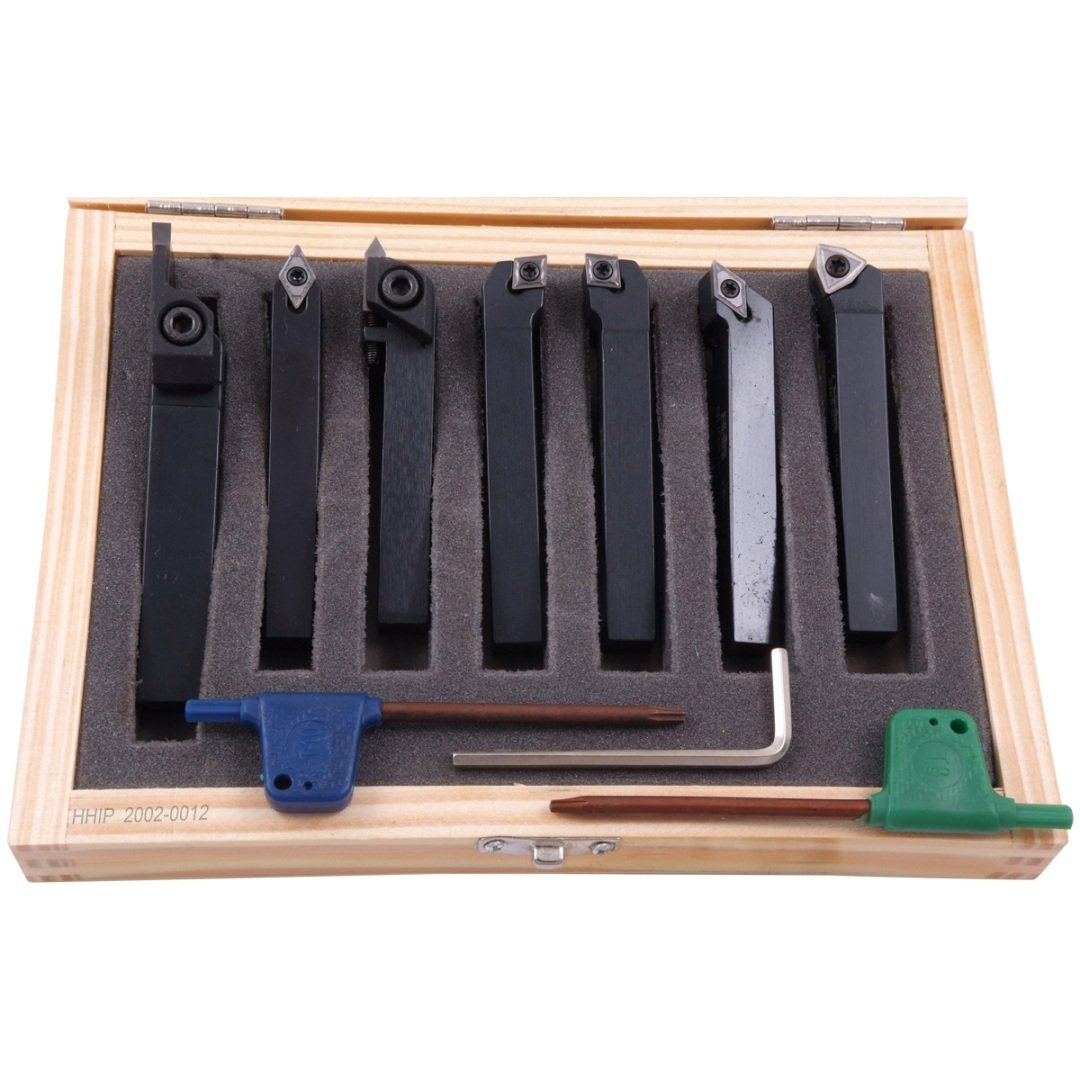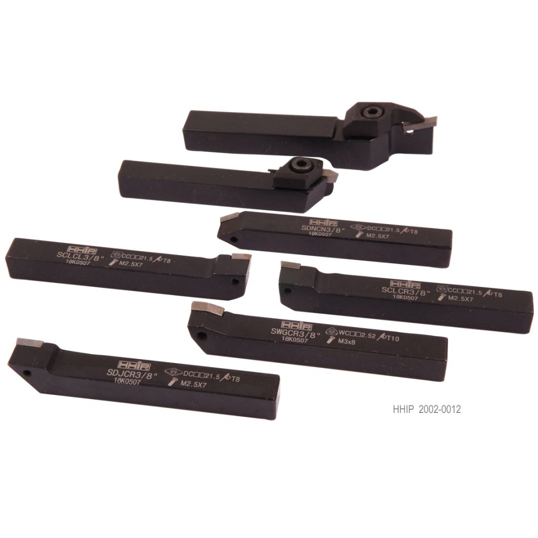 HHIP 7 Piece 3/8″ Indexable Cut Off & Turning Tool Set Carbide inserts and wrench included. Multi-purpose. Includes 90 degree right hand holder A,93 degree right hand holder B, 95 degree right hand holder C, 62.5 degree right hand holder D, 95 degree left hand holder E, external threading holder F and cut-off tool holder G. Complete with fitted case. Styles C & E take CCMT060204 inserts (#6003-2021). Styles B & D take DCMT070202 inserts (#2002-0104). Style F takes a JCL-15-120 insert (#2002-0105). Style G takes a JCQ3 insert (#2002-0106). Style A takes a WCMX50308 insert (#2002-0107). 7 piece set of replacement screws is available (#2002-0122).