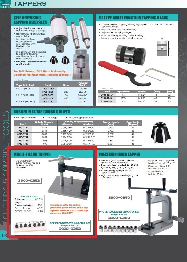 7 PIECE REPLACEMENT ADAPTERS FOR MINI E-Z HAND TAPPER (3900-0253). Key features: 7 Piece Replacement Adapters; Fits our Mini E-Z Hand Tapper #3900-0252.