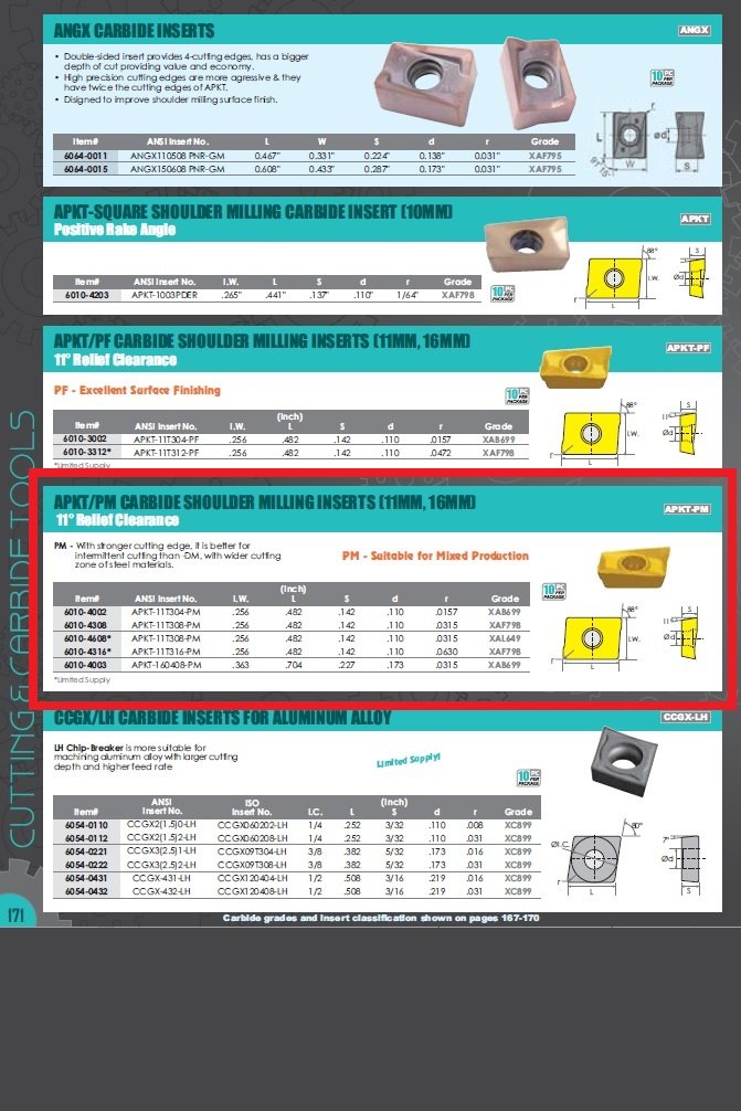 APKT-11T304-PM COATED CARBIDE SHOULDER MILLING INSERT (6010-4002). Key features: APKT-11T304-PM Shoulder Milling Insert; I.W. is 0.256″..