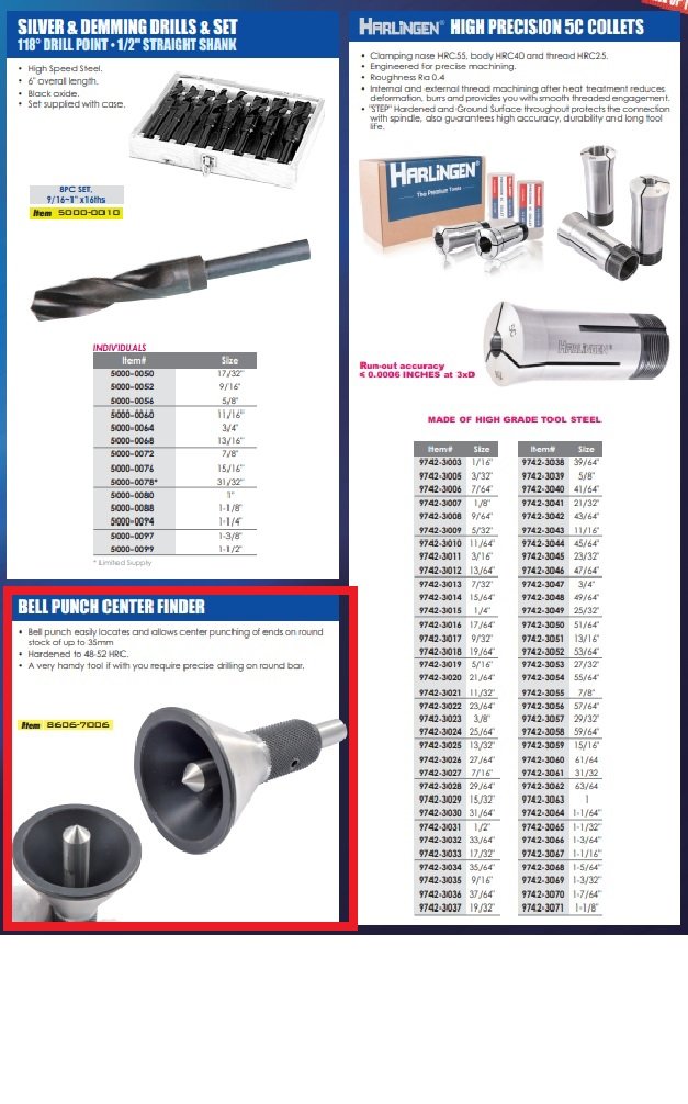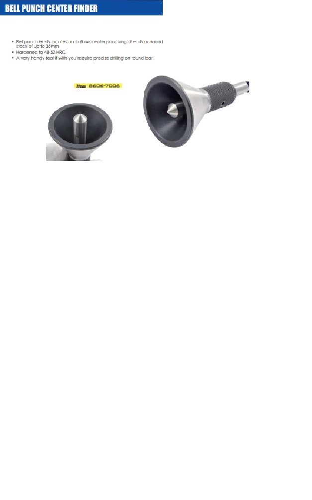 HHIP Bell Punch Center Finder Bell punch easily locates and allows center punching of ends on round stock of up to 35mm. Hardened to 48-52 HRC. A very handy tool if with you require precise drilling on round stock.