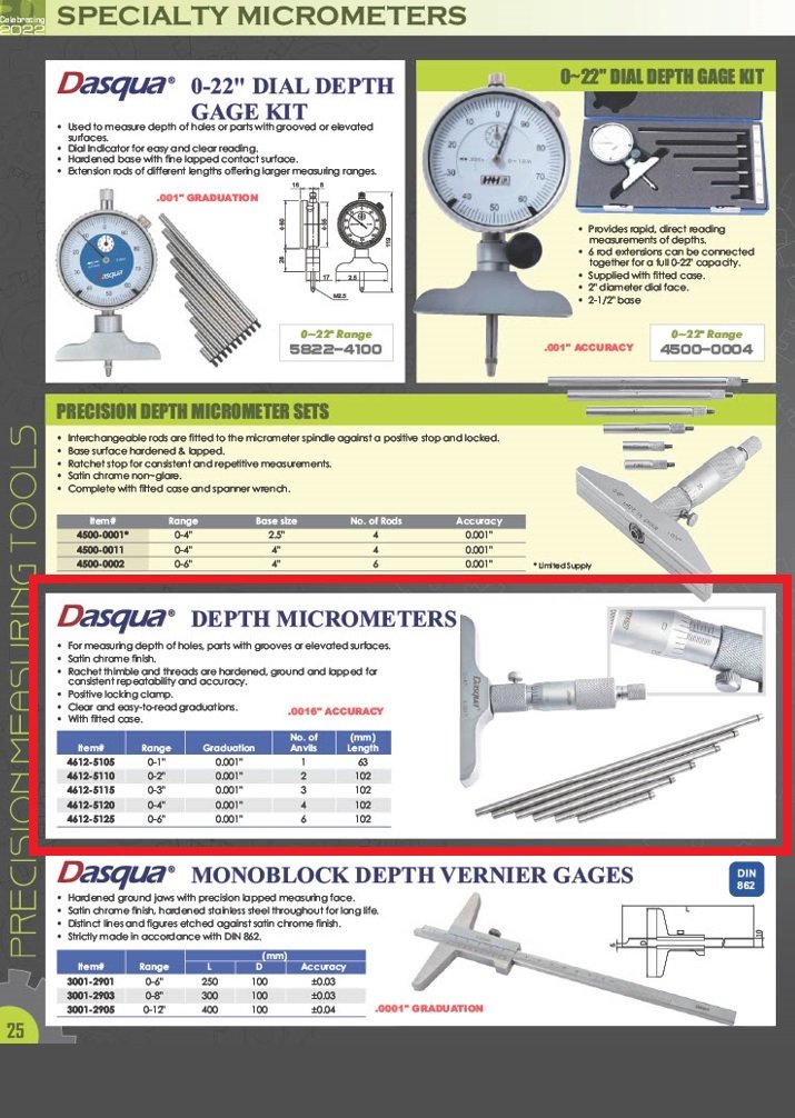 DASQUA 0-1″ DEPTH MICROMETER (4612-5105) (SKU: 4612-5105)