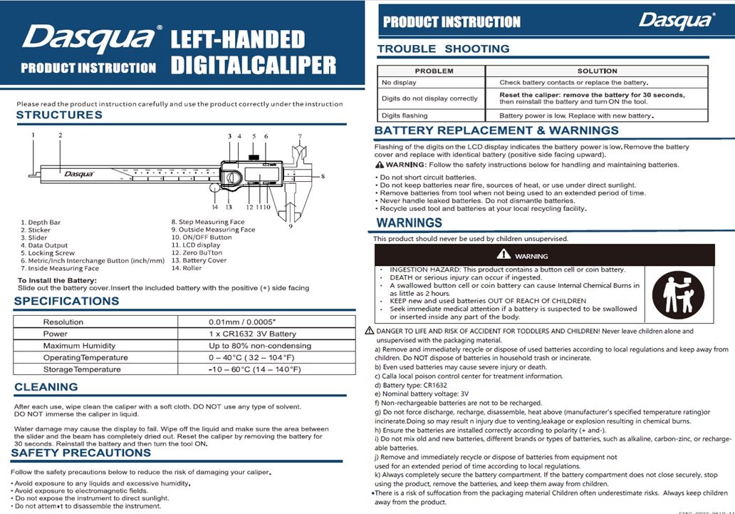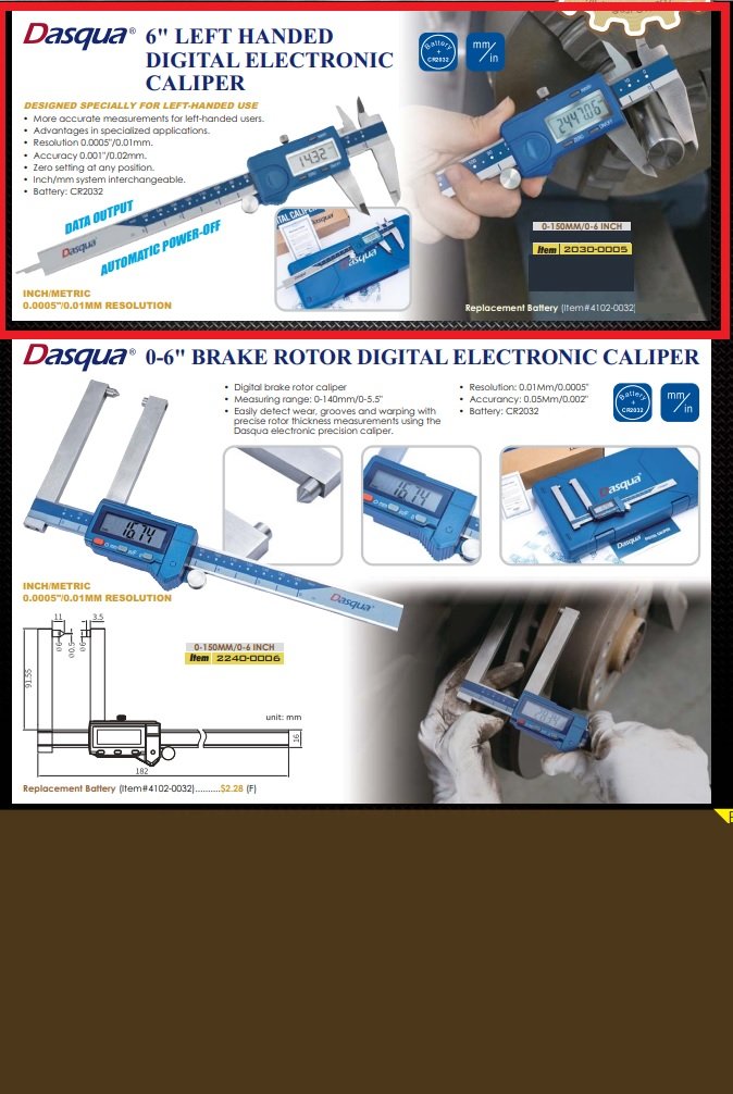 Dasqua 0-150mm/0-6″ Left-Handed Digital Caliper More accurate measurements for left-handed users. Advantages in specialized applications. Resolution is 0.0005″/0.01mm. Accuracy is 0.001″/0.02mm. Zero setting at any position. Inch/mm interchangeable. Replacement battery is item#4102-0033.