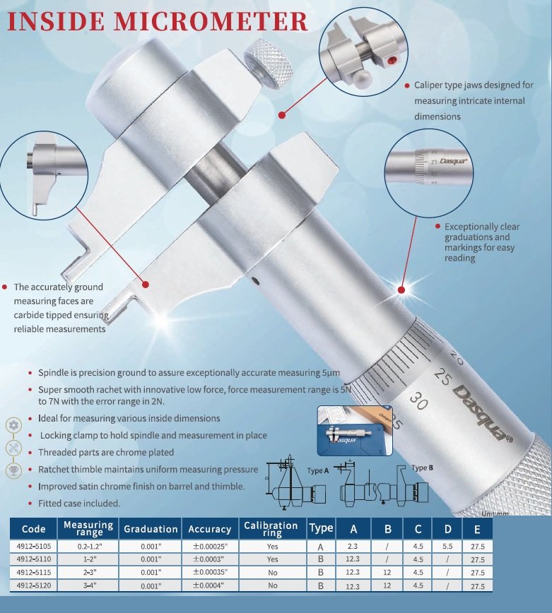 DASQUA 0.2-1.2″ 0.001″ INSIDE MICROMETER WITH RING GAGE (4912-5105)Availability: In stock