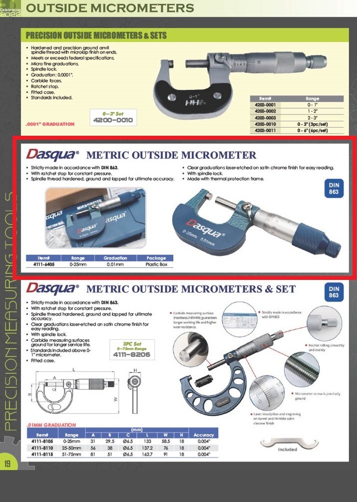 DASQUA 0-25MM OUTSIDE MICROMETER .01MM (SKU: 4111-6405)