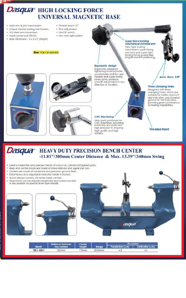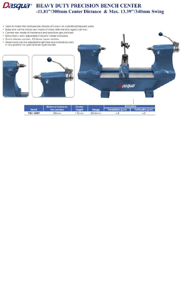 Dasqua 170mm Swing X 300mm Center to Center Heavy Duty Precision Bench Center Used to make fast and precise checks of runout on cylindrical/tapered parts. Base and center stocks are made of stress-relieved and aged cast iron. Centers are made of hardened and precision ground steel. Extra heavy duty adjustable indicator holder included. Quick release centers, #2 Morse taper centers. Head stock can be adjusted lengthwise and locked securely in any position by special lever type handle. Parallelism (μm) <=8mm. Verticality (μm) <=5mm.
