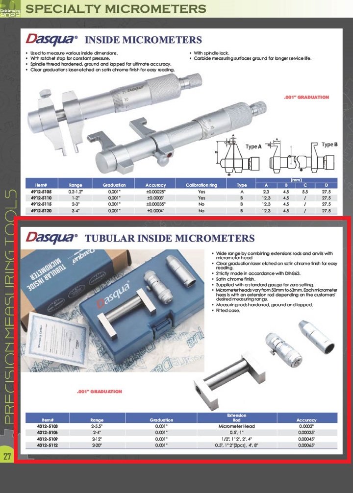 DASQUA 2-5.5″ 0.001″ INSIDE TUBE MICROMETER (4312-5103)Availability: In stock