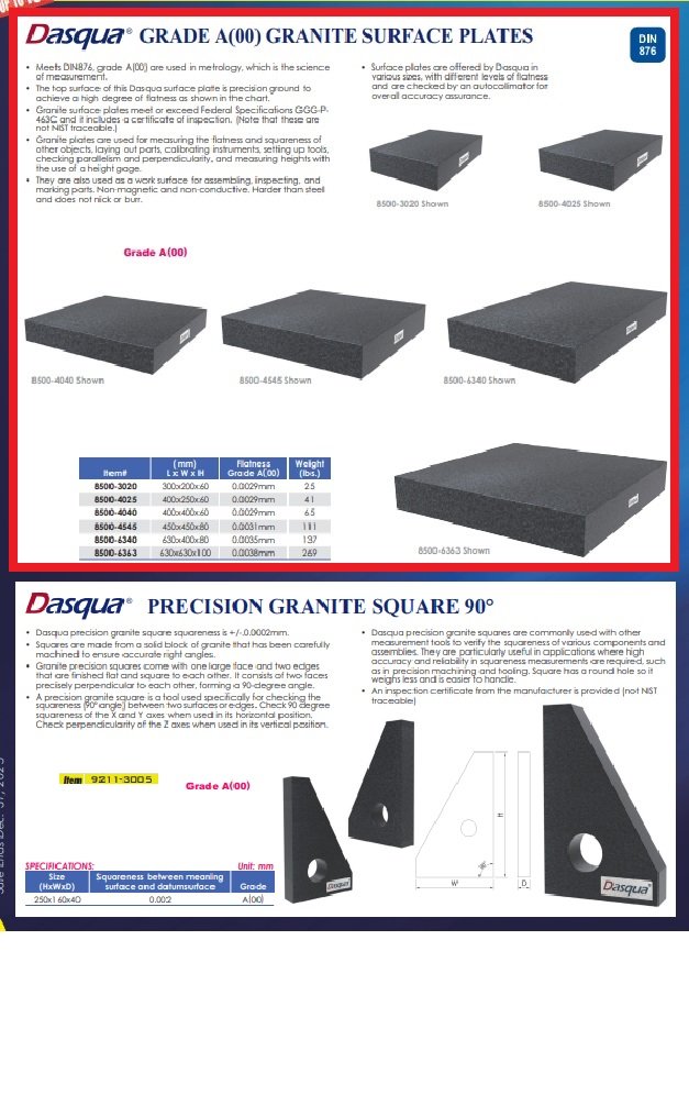 Dasqua 300 X 200 X 60mm Grade A Granite Surface Plate The top surface of this plate is precision ground to achieve a high degree of flatness and the accuracy is +/-.0001″. It is a Grade A (Grade 0) plate. Granite surface plates meet or exceed Federal Specifications GGG-P-463C and it includes a certificate of inspection. (Note that these are not NIST traceable.) Granite plates are used for measuring the flatness and squareness of other objects, laying out parts, calibrating instruments, setting up tools, checking parallelism and perpendicularity, and measuring heights with the use of a height gage. They are also used as a work surface for assembling, inspecting, and marking parts. Non-magnetic and non-conductive. Harder than steel and does not nick or burr. Surface plates are offered by HHIP in various sizes and brands, with different levels of flatness and accuracy and are checked by an auto collimator for overall accuracy assurance.