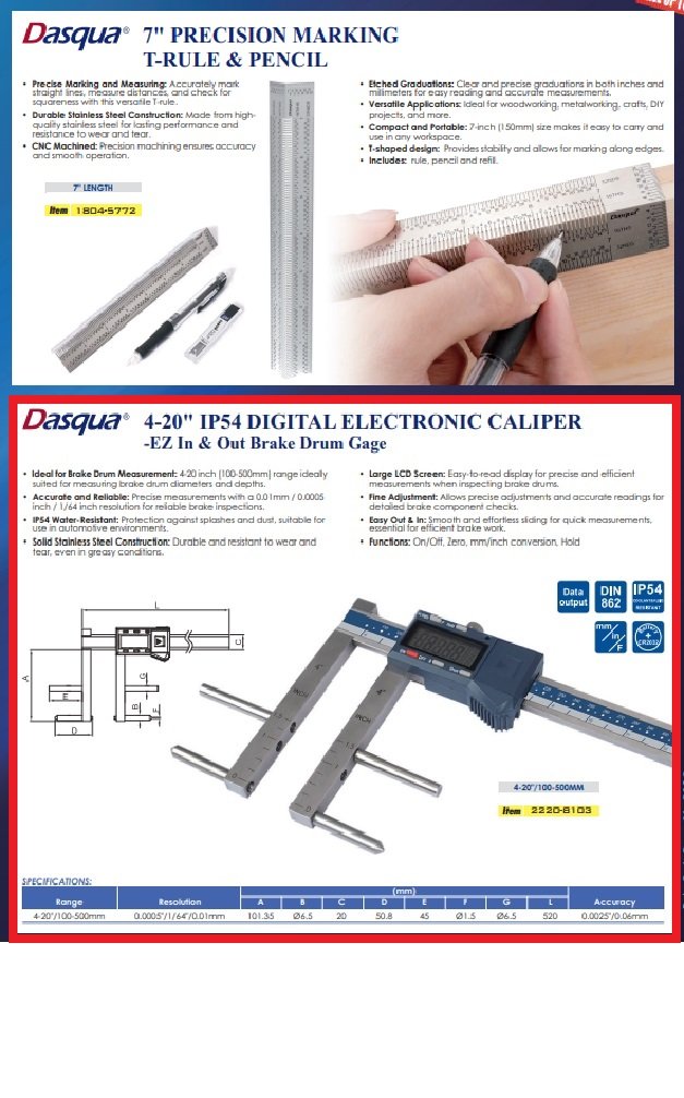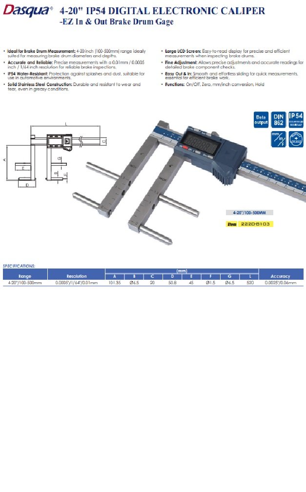 Dasqua 4-20″ EZ IP54 Electronic Brake Drum Caliper 4-20″ (100-500mm) range is ideally suited for measuring brake drum diameters and depths. Precise measurements with a 0.01mm / 0.0005″ / 1/64″ resolution for reliable brake inspections. IP54 Water-resistant caliper provides protection against splashes and dust, suitable for use in automotive environments. Solid stainless steel construction makes this caliper durable and resistant to wear and tear, even in greasy conditions. Fine adjustment allows for precise adjustments and accurate readings for detailed brake component checks. Large LCD Screen provides you with an easy-to-read display for precise and efficient measurements when inspecting brake drums. Smooth and effortless sliding of the scale for quick measurements which is essential for efficient brake work. Functions include on/off, zero, mm/inch conversion, and hold.