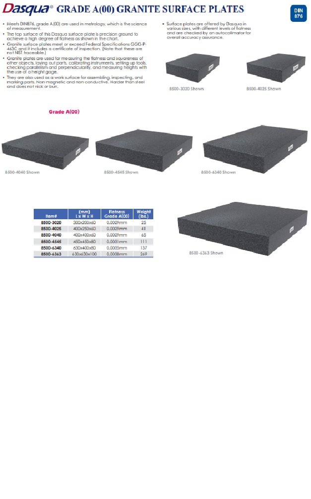 Dasqua 400 X 400 X 60mm Grade A Granite Surface Plate The top surface of this plate is precision ground to achieve a high degree of flatness and the accuracy is +/-.0001″. It is a Grade A (Grade 0) plate. Granite surface plates meet or exceed Federal Specifications GGG-P-463C and it includes a certificate of inspection. (Note that these are not NIST traceable.) Granite plates are used for measuring the flatness and squareness of other objects, laying out parts, calibrating instruments, setting up tools, checking parallelism and perpendicularity, and measuring heights with the use of a height gage. They are also used as a work surface for assembling, inspecting, and marking parts. Non-magnetic and non-conductive. Harder than steel and does not nick or burr. Surface plates are offered by HHIP in various sizes and brands, with different levels of flatness and accuracy and are checked by an auto collimator for overall accuracy assurance.