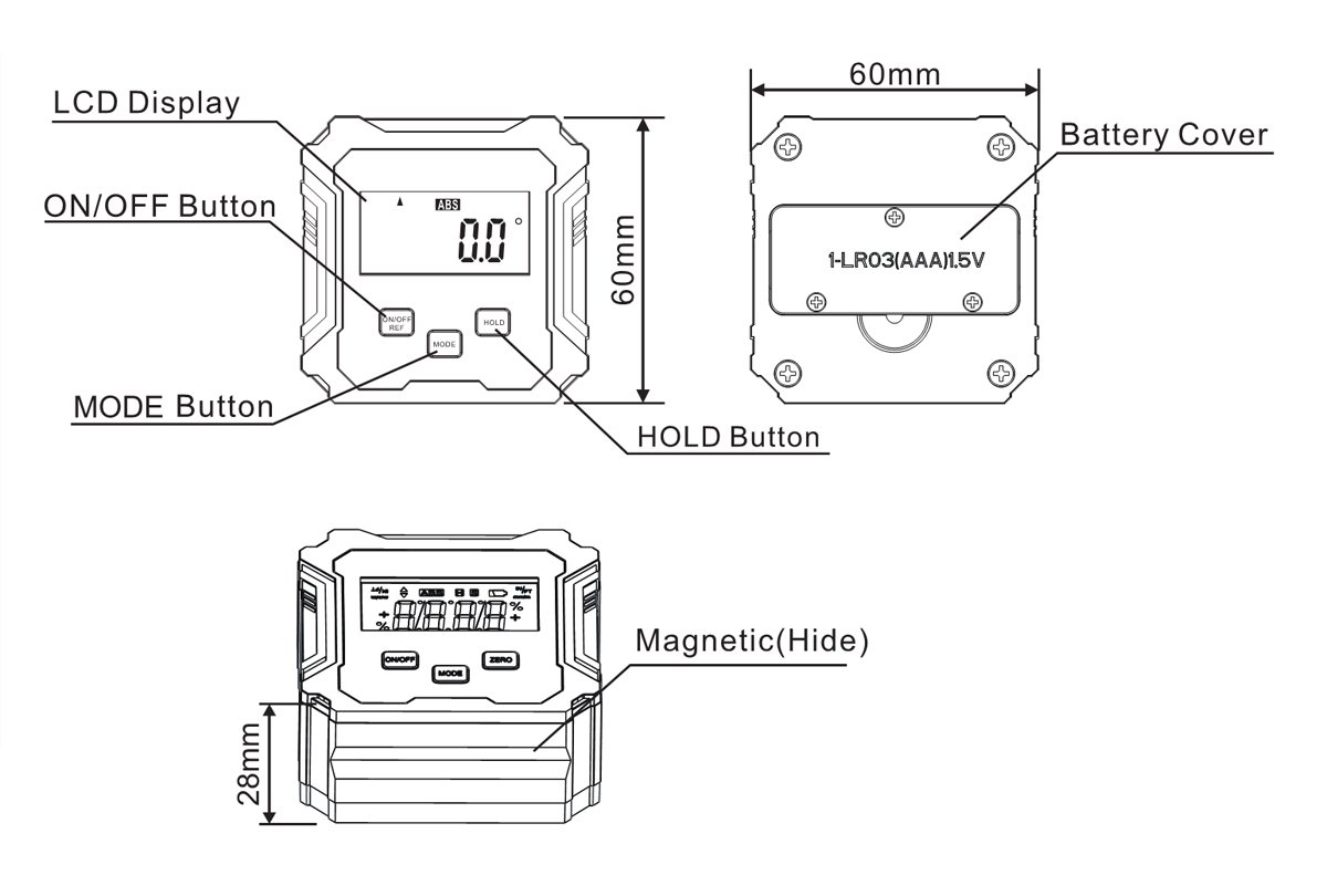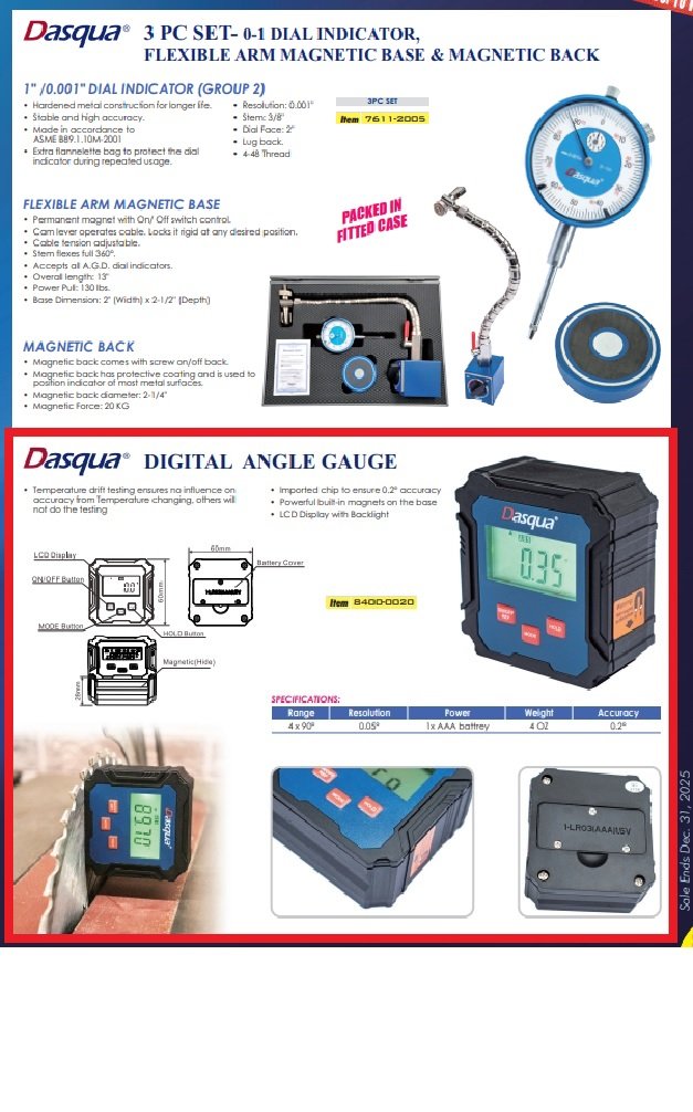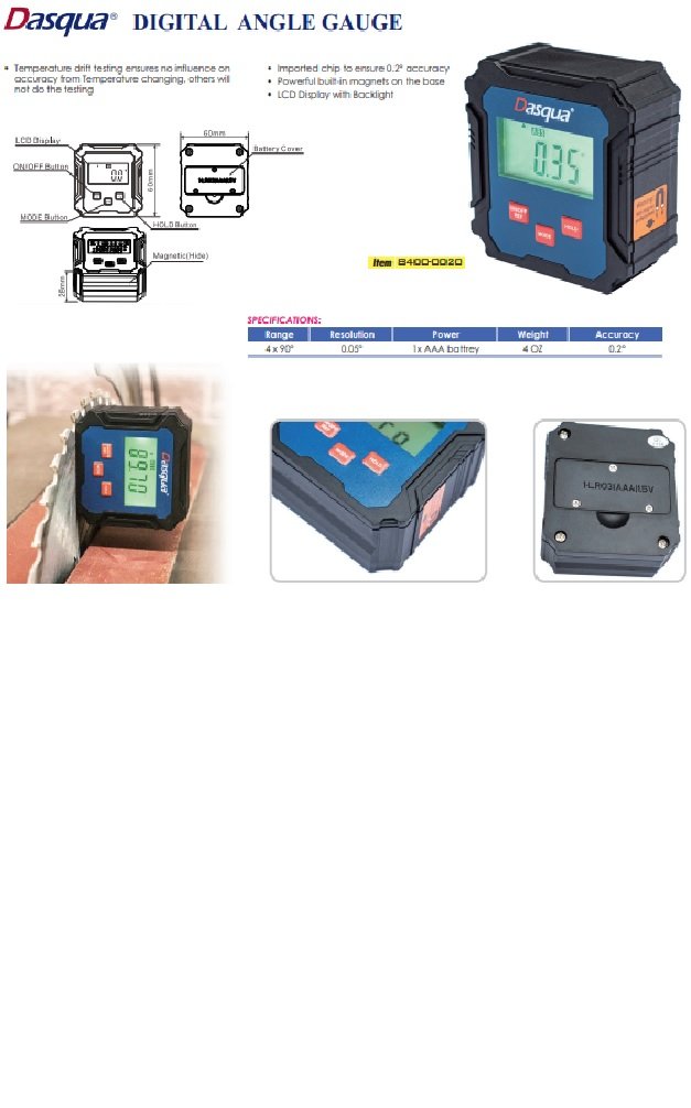 Dasqua Economy Digital Angle Gage LCD Display with backlight. Powerful built-in magnets on the base. Imported chip to ensure 0.2 degree accuracy. Temperature drift testing ensures changing temperatures will not influence accuracy. Others cannot attest to the same testing. Resolution is 0.05 degrees.