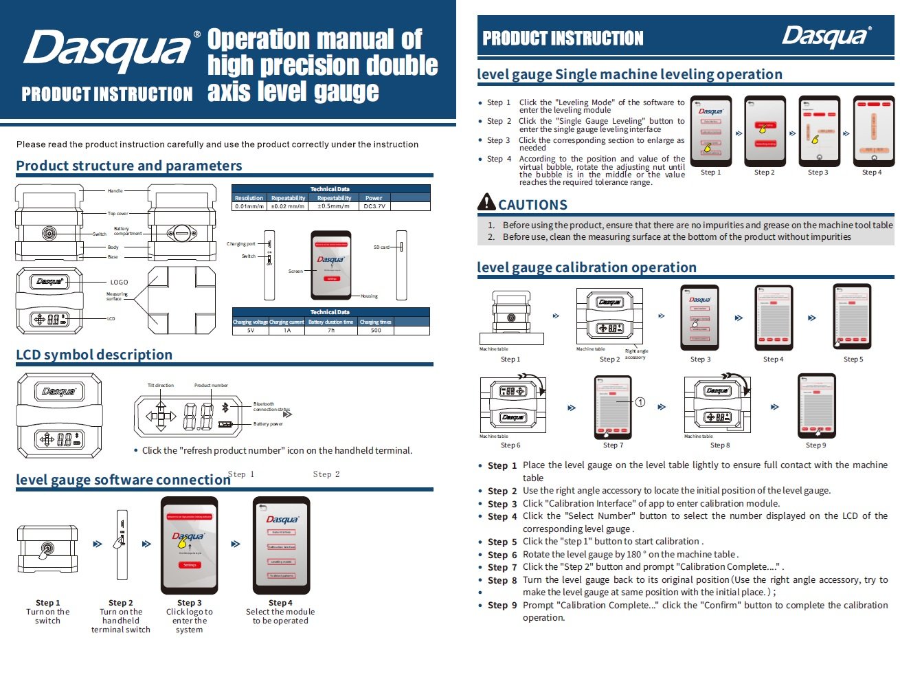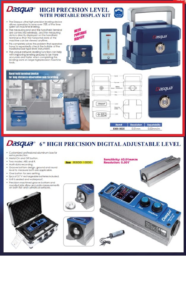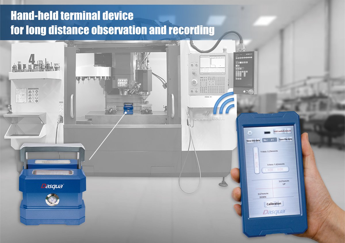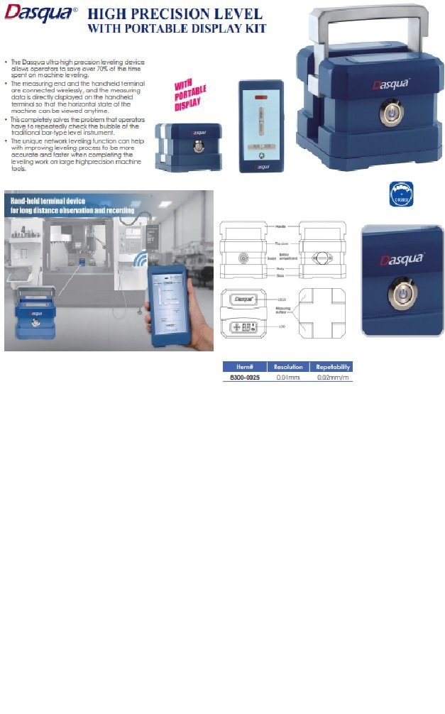 Dasqua High Precision Level With Portable Display Kit The Dasqua ultra-high precision leveling device allows operators to save over 70% of the time spent on machine leveling. The measuring end and the handheld terminal are connected wirelessly, and the measuring data is directly displayed on the handheld terminal so that the horizontal state of the machine can be viewed anytime. This completely solves the problem that operators have to repeatedly check the bubble of the traditional bar-type level instrument. The unique network leveling function can help with improving leveling process to be more accurate and faster when completing the leveling work on large highprecision machine tools. This is a hand-held terminal device for long distance observation and recording. Precision-machined groove bottom and rounded side allow accurate measurements on both flat and cylindrical surfaces. Repeatability is 0.02mm/m. Metal on/off button. Completely sealed and waterproof.