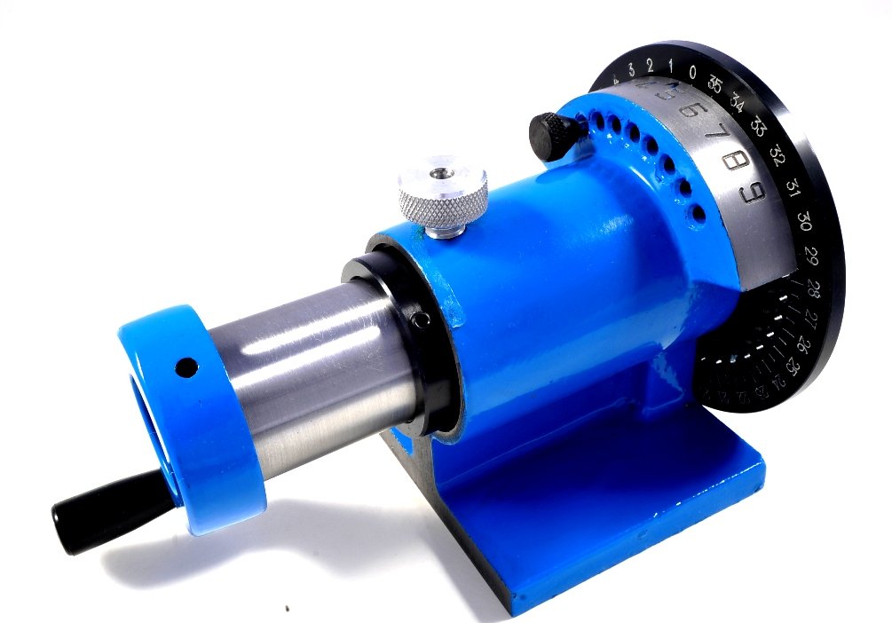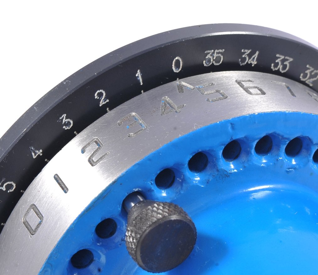 - 5″ diameter index plate has a 36 hole circle and is graduated by 0 to 35 for direct indexing in 10° steps and is marked in 5° increments