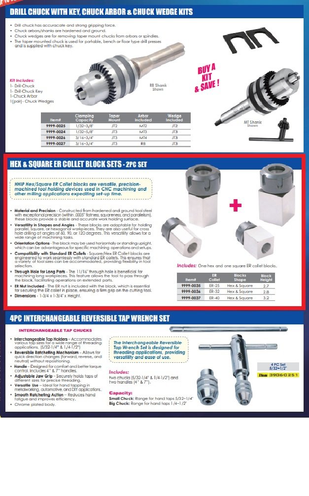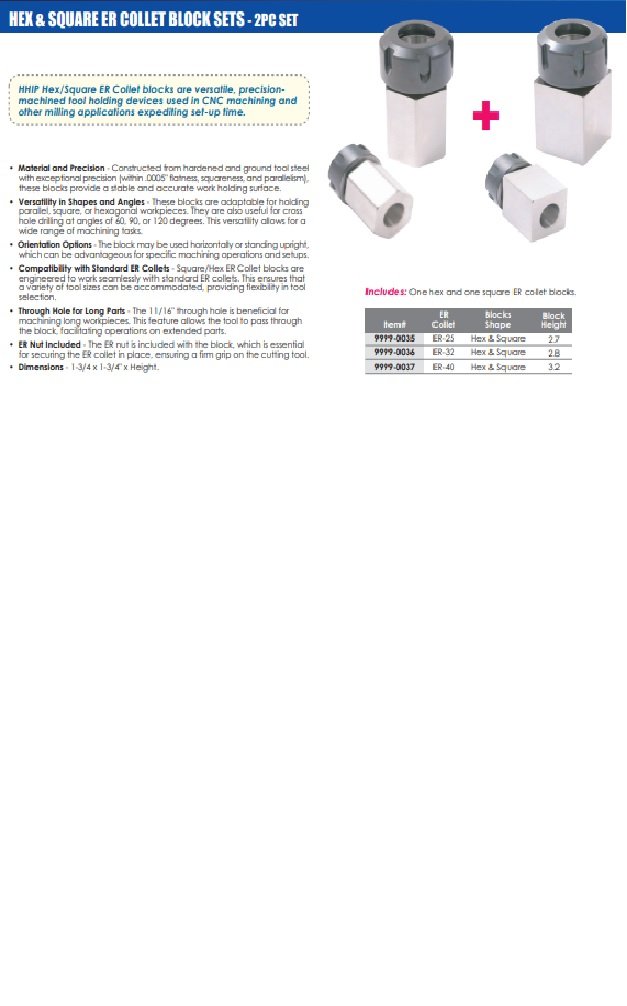 HHIP ER32 Square & Hex Collet Block Set HHIP Hex and Square ER Collet blocks are versatile, precision-machined tool holding devices used in CNC machining and other milling applications expediting set-up time. Constructed from hardened and ground tool steel with exceptional precision (within .0005″ flatness, squareness, and parallelism), these blocks provide a stable and accurate work holding surface. These blocks are adaptable for holding parallel, square, or hexagonal workpieces. They are also useful for cross hole drilling at angles of 60, 90, or 120 degrees. This versatility allows for a wide range of machining tasks. The block may be used horizontally or standing upright which can be advantageous for specific machining operations and setups. Square and Hex ER Collet blocks are engineered to work seamlessly with standard ER collets. This ensures that a variety of tool sizes can be accommodated, providing flexibility in tool selection. The 11/16″ through hole is beneficial for machining long workpieces. This feature allows the tool to pass through the block, facilitating operations on extended parts. The ER nut is included with the block, which is essential for securing the ER collet in place, ensuring a firm grip on the cutting tool. Block is 1-3/4 x 1-3/4. The overall height with the ER nut is shown in the chart.