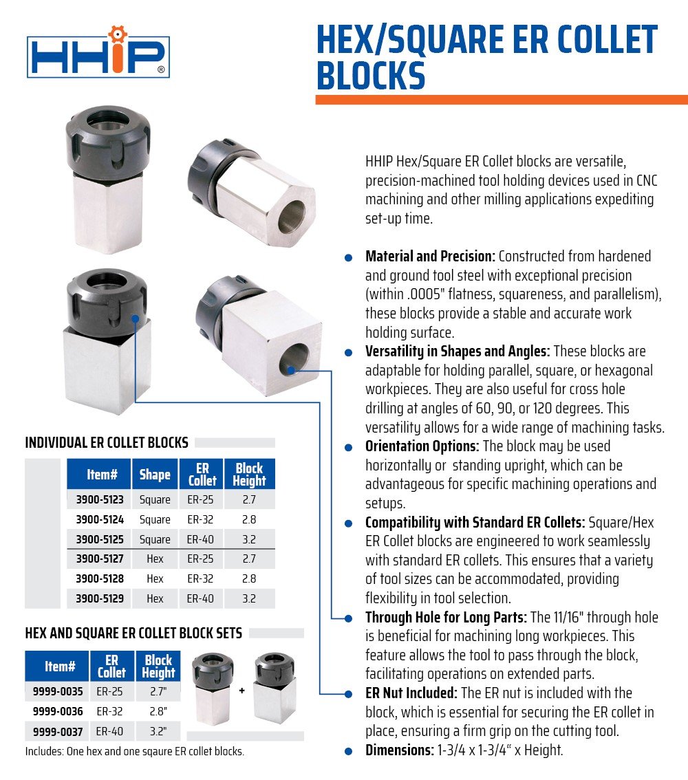 - HHIP Hex and Square ER Collet blocks are versatile, precision-machined tool holding devices used in CNC machining and other milling applications expediting set-up time.