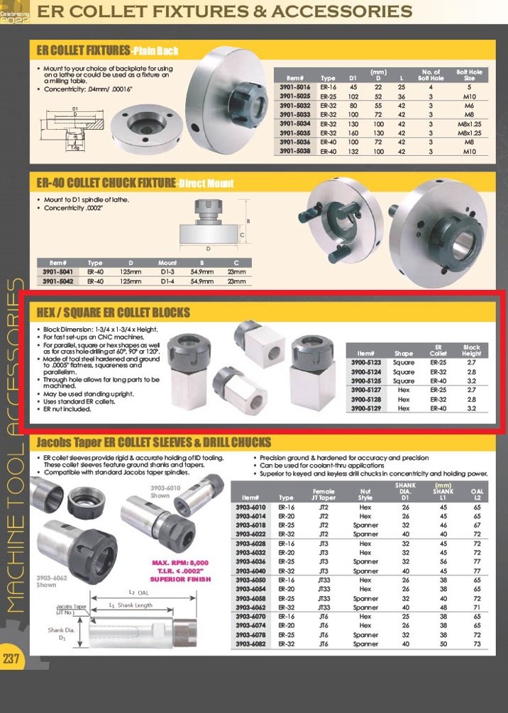 - Square and Hex ER Collet blocks are engineered to work seamlessly with standard ER collets.