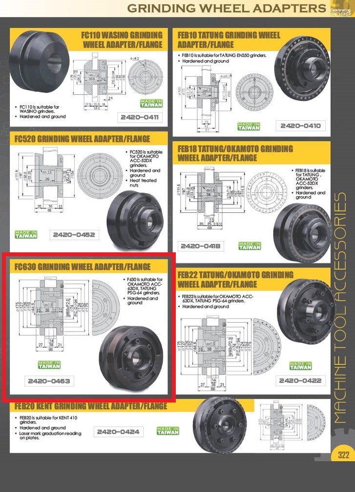 FC630 OKAMOTO/TATUNG GRINDING WHEEL ADAPTER (2420-0463). Key features: FC630 Okamoto/Tatung Grinding Wheel Adapter; F630 is suitable for OKAMOTO ACC-63DX, TATUNG PSG-64 grinders..
