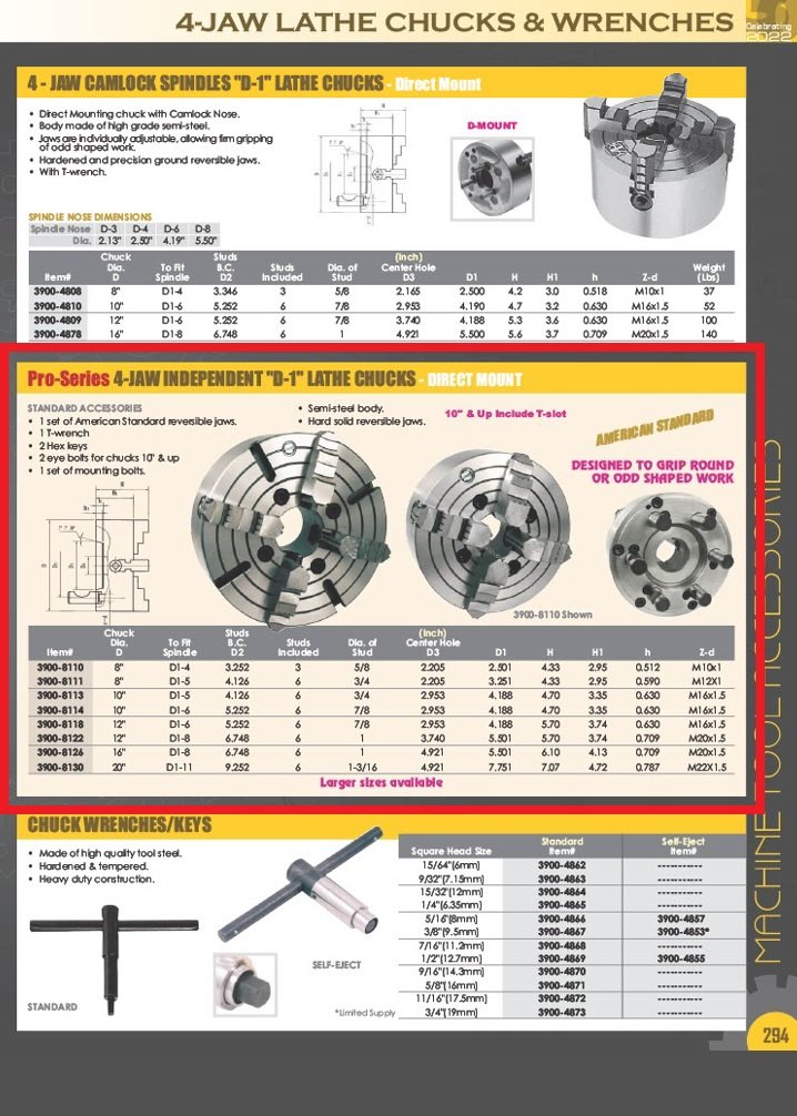 TRUCK ONLY++ 16 INCH 4-JAW (D1-8) CAMLOCK LATHE CHUCK-GATOR + MUST CALL TO ORDER + | Semi-steel body. | Hard solid reversible jaws. | STANDARD ACCESSORIES?1 set of American Standard reversible jaws.1 T-wrench2 Hex keys2 eye bolts for chucks 10″ & up1 set of mounting bolts.