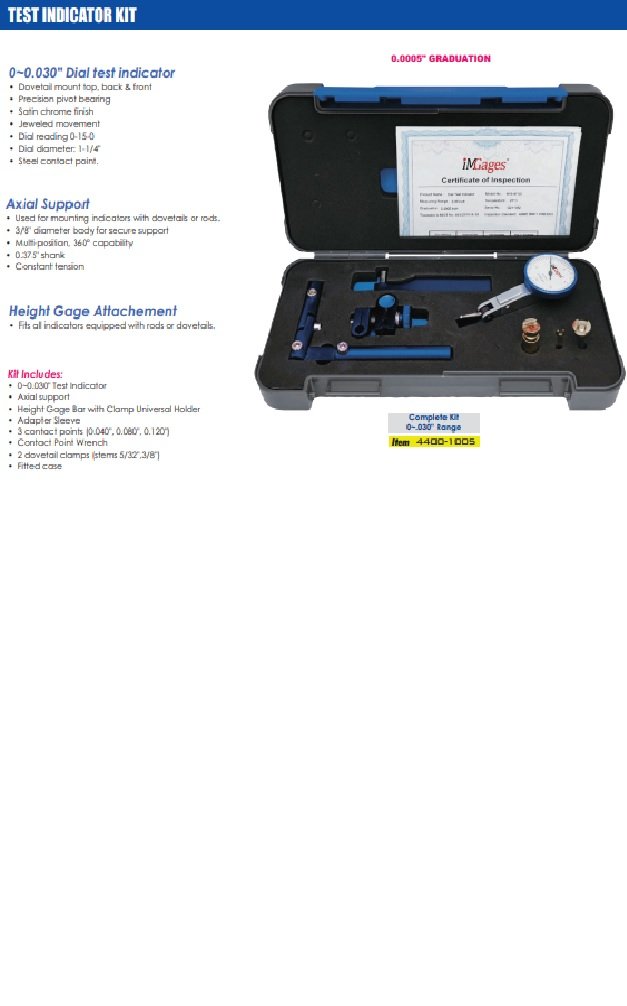 • Kit Includes 1 0~0.030″ Test Indicator, 1 Axial Support, 1 Height Gage Bar with Clamp Universal Holder, 1 Adapter Sleeve, 3 contact points (0.040″, 0.080″, 0.120″), 1 Contact Point Wrench, 2 dovetail clamps (stems 5/32″,3/8″) and a fitted case.