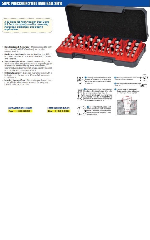 • A 50 Piece (25 pair) precision steel gage ball set is commonly used for measuring, inspection, calibration, and gaging applications.