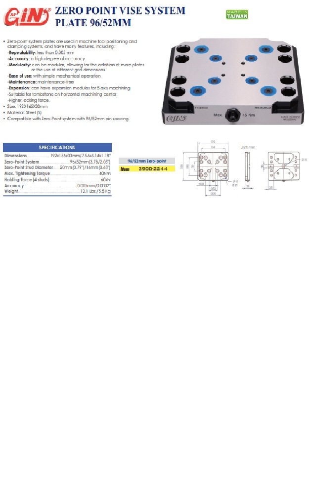 HHIP 52/96mm Pin Spacing Zero-Point Plate For 5-Axis CNC Vise Made in Taiwan. 192 X 165 X 30mm. Suitable for tombstone on horizontal machining center. High locking force. Made of steel. Maintenance free. Simple, easy to use, mechanical operation. Zero-point system plates are used in machine tool positioning and clamping systems and have many features including repeatability of less than 0.005mm. The system allows for the addition of more plates or the use of different grid dimensions and you can add expansion modules for 5-axis machining.