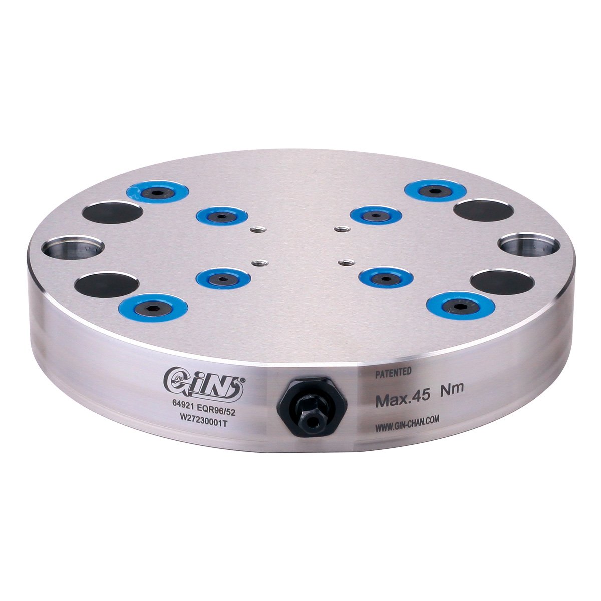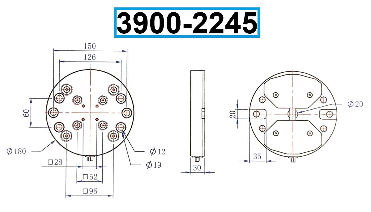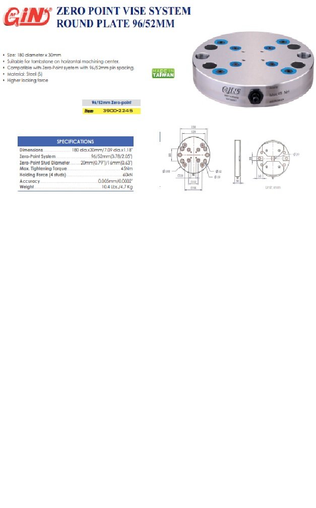 HHIP 52/96mm Pin Spacing Zero-Point Round Plate For 5-Axis CNC Vise Made in Taiwan. 180 diameter X 30mm. Suitable for tombstone on horizontal machining center. High locking force. Made of steel. Maintenance free. Simple, easy to use, mechanical operation. Zero-point system plates are used in machine tool positioning and clamping systems and have many features including repeatability of less than 0.005mm. The system allows for the addition of more plates or the use of different grid dimensions and you can add expansion modules for 5-axis machining.