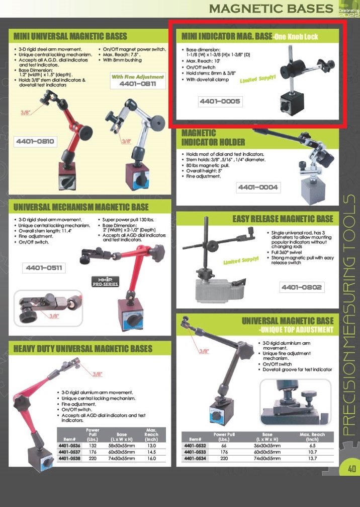MINI INDICATOR MAGNETIC BASE WITH ONE KNOB LOCK (4401-0005). Key features: Mini Indicator Magnetic Base with One Knob Lock; Maximum reach is 10″..