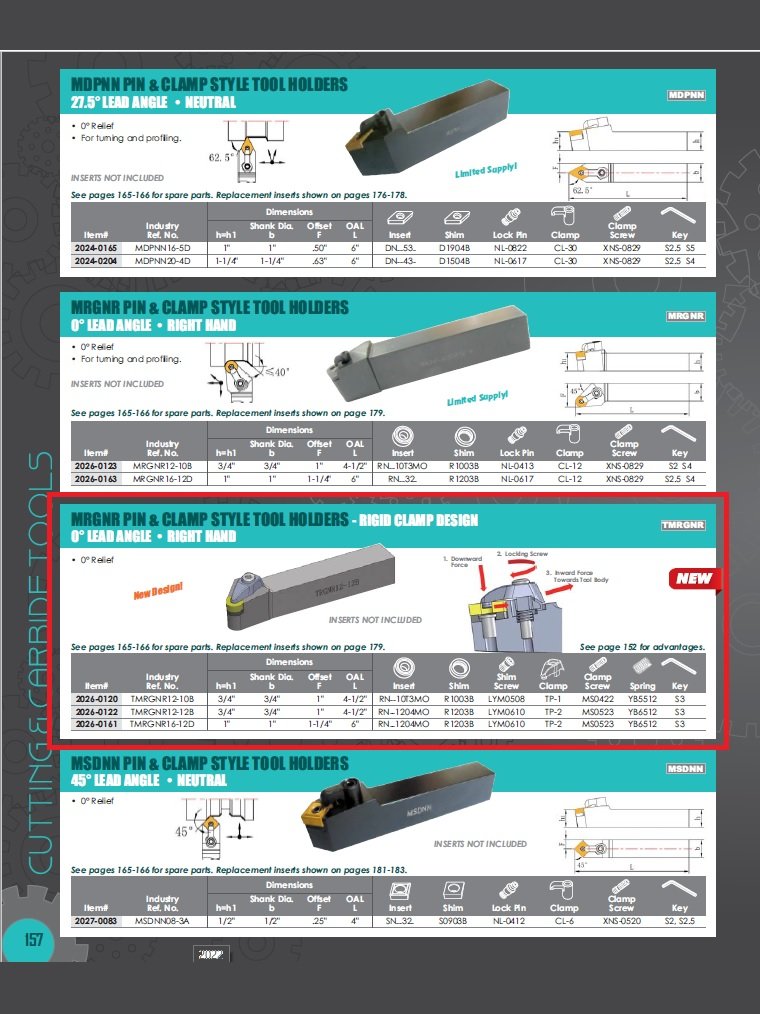 HHIP 2026-0120 – MRGNR 12-10B Turning Tool Holder – New Rigid Clamp Design Right hand. 0 Degree lead angle for turning to square shoulders. Zero degree relief. New rigid style top & hole clamping design provides increased stability & security for productive turning of large components and heavy machining. Use with RN 10T3MO inserts. Shim is #2100-1003. Shim screw is #2100-4300. Clamp is #2100-2901. Clamp screw is #2100-4350. Spring is #2100-4380. Hex key is #2100-1084. Please see chart picture for sizing information. When replacing the insert, apply enough pressure to push the clamp forward and align it with the hole as you tighten it. Please see the video of the installation process.