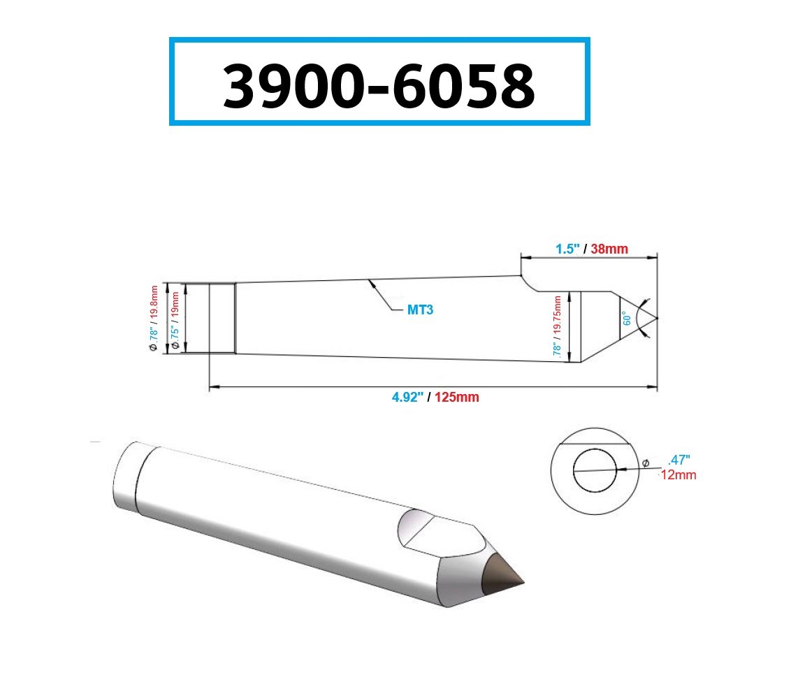 MT3 CARBIDE TIPPED HALF-NOTCHED DEAD CENTER (3900-6058). Key features: MT3 Carbide Tipped, Half-Notched Dead Center; Made of tool steel, hardened and ground..
