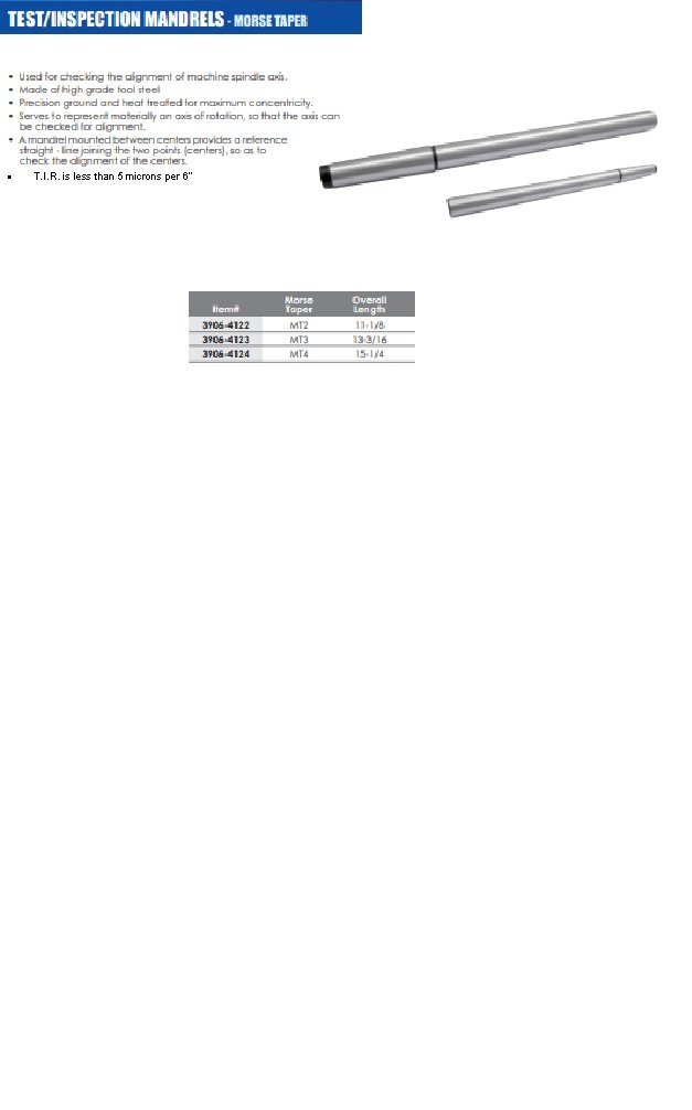 HHIP MT4 X 386mm Test/Alignment Mandrel Used for checking the alignment of machine spindle axis. Made of high grade tool steel. Precision ground and heat treated for maximum concentricity. Serves to represent materially an axis of rotation, so that the axis can be checked for alignment. A mandrel mounted between centers provides a straight-line reference joining the two points (centers), so you can check the alignment of the centers. T.I.R. is less than 5 microns per 6″.