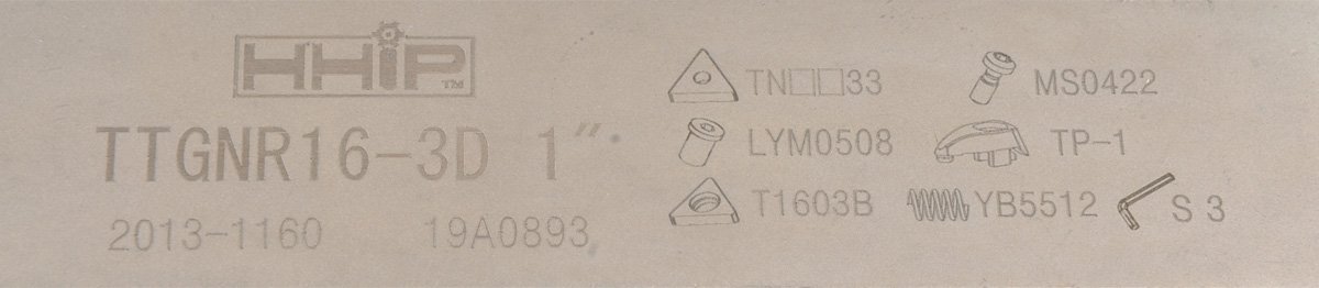 HHIP 2013-1160 – MTGNR 16-3D Turning Tool Holder – New Rigid Clamp Design Right hand. 0 Degree lead angle for turning to square shoulders. Zero degree relief. New rigid style top & hole clamping design provides increased stability & security for productive turning of large components and heavy machining. Use with TNMA, TNMG OR TNMM inserts. Shim is #2100-1603. Shim screw is #2100-4300. Clamp is #2100-2901. Clamp screw is #2100-4350. Spring is #2100-4380. Please see chart picture for sizing information. When replacing the insert, apply enough pressure to push the clamp forward and align it with the hole as you tighten it. Please see the video of the installation process.