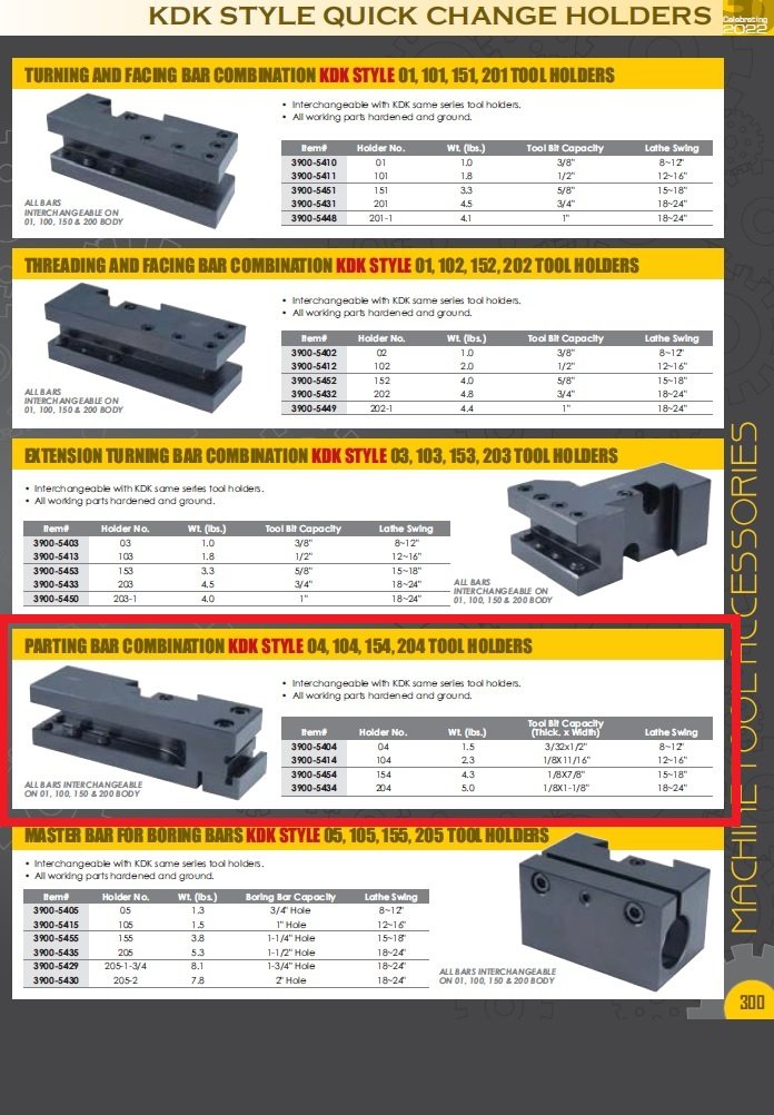 PARTING BAR HOLDER KDK-204 TYPE (3900-5434). Key features: KDK-204 Type Parting Bar Combination Holder; Blade Capacity is 1/8″ X 1-1/8″.