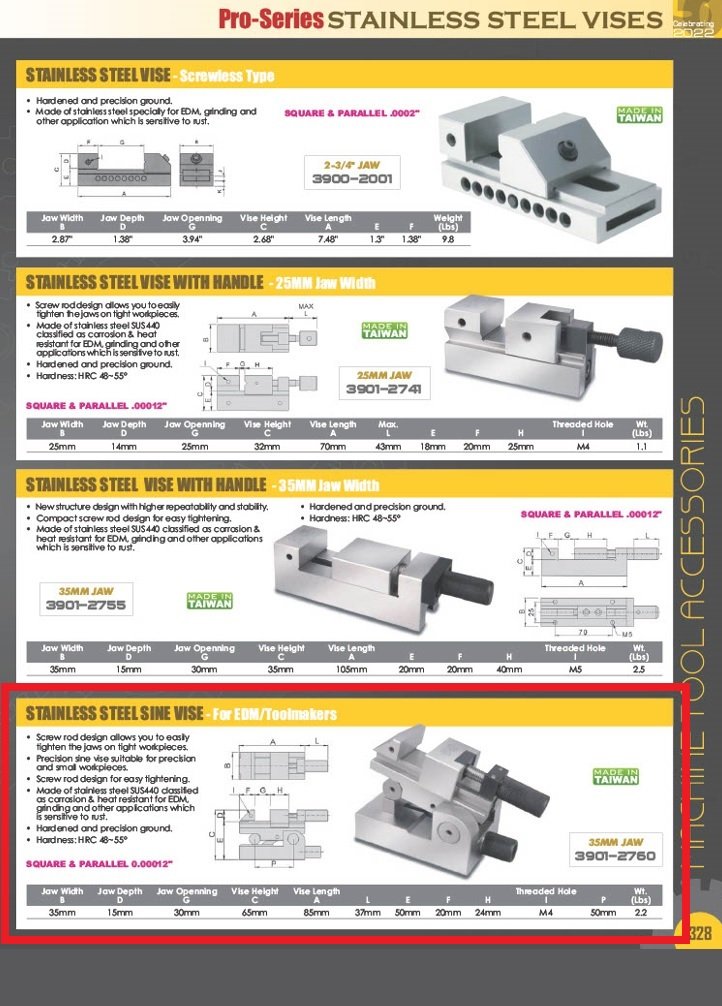 PRO-SERIES 35MM EDM STAINLESS STEEL SINE VISE WITH HANDLE (3901-2760). Key features: Pro-Series 35mm EDM Stainless Steel Sine Vise With Handle; Square & Parallel to .00012″..